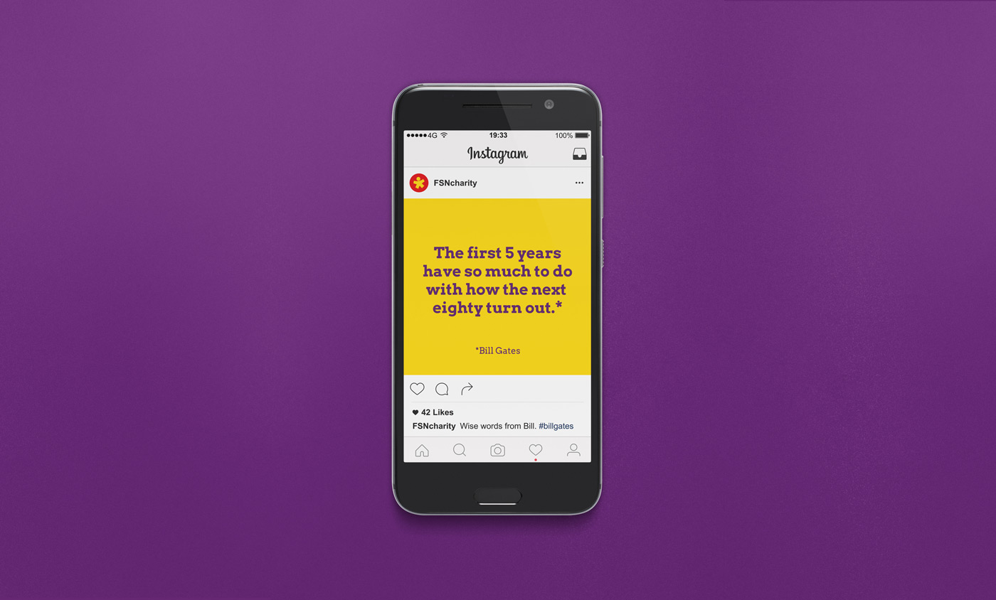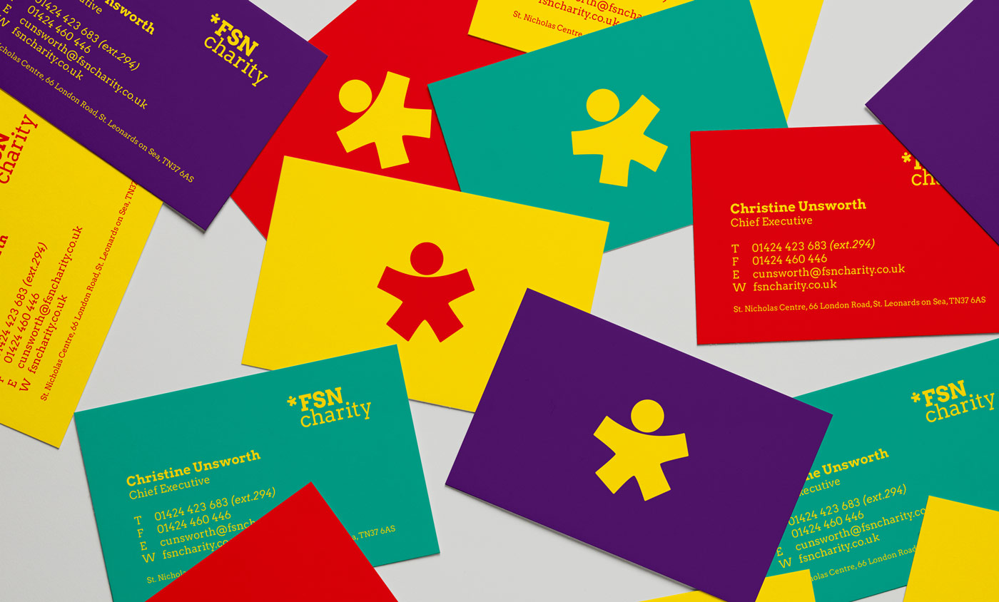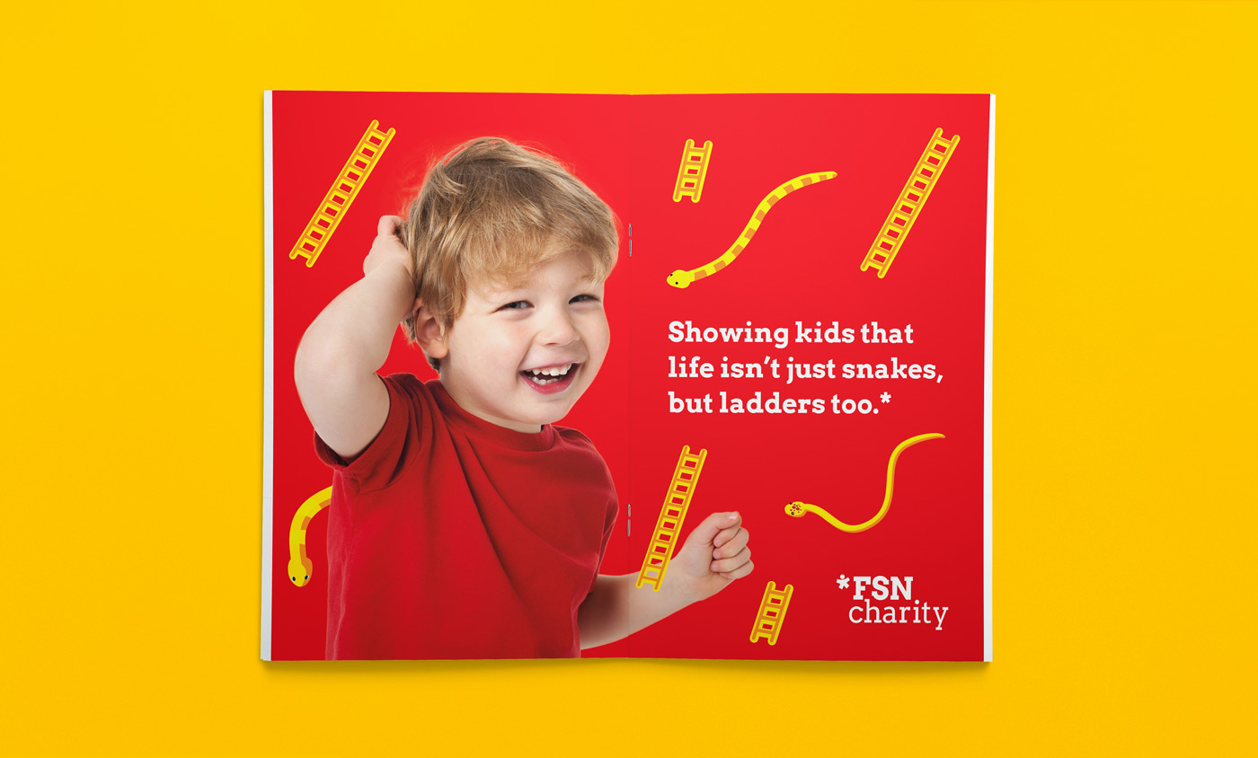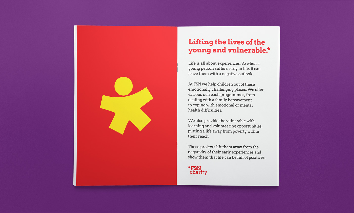 FSN is a charity that works with vulnerable young people who have experienced early setbacks in life such as grief, neglect and poverty. A new colourful identity was inspired by the sense of youthfulness, something FSN works to give back. The brandmark doubles up as an asterix, connecting the logo with stories and messaging.